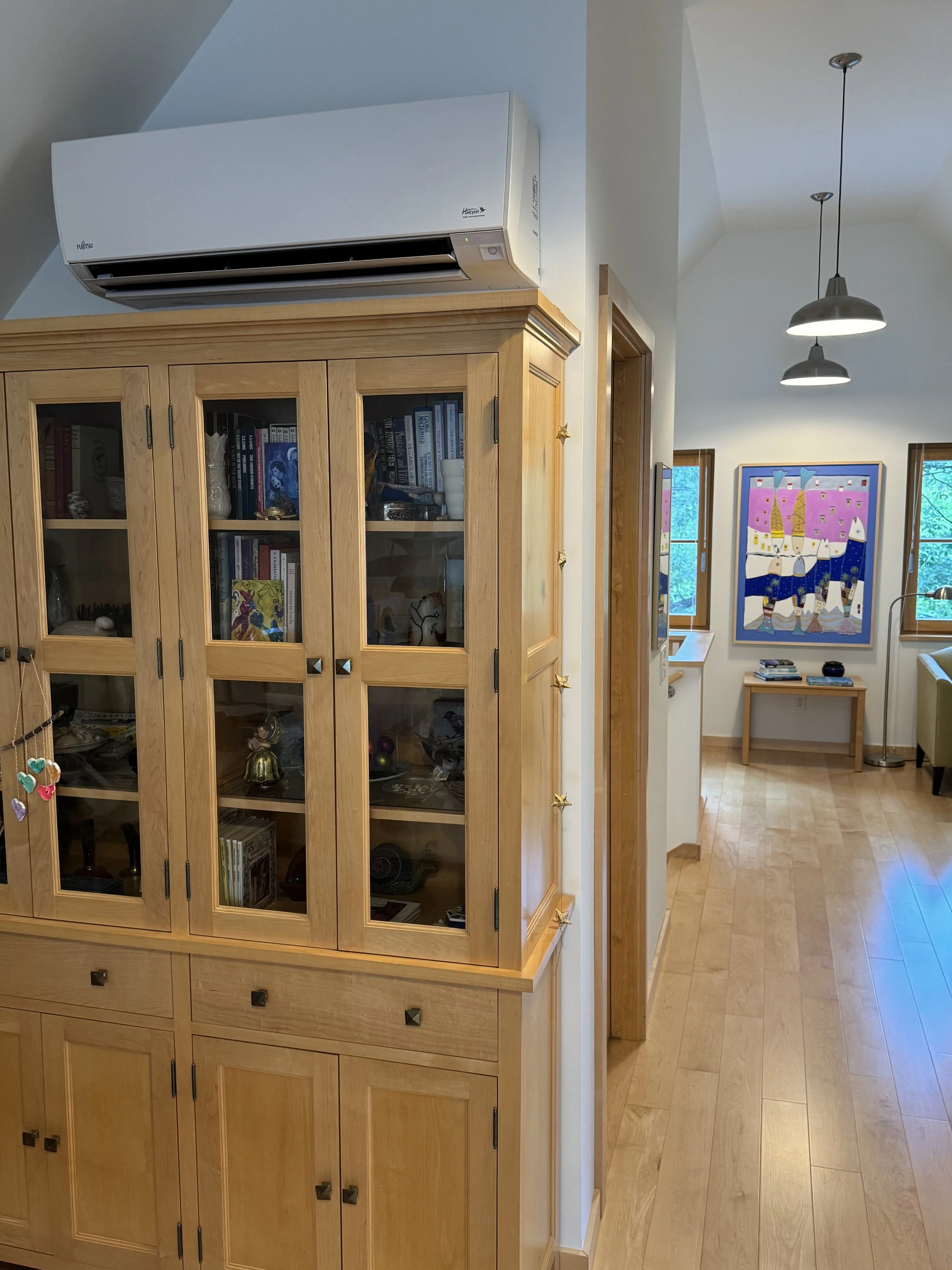The capacity of even a small 50,000 BTU furnace would overwhelm our net-zero house. Instead, two air-sourced heat pumps, called mini-splits, heat and cool our home—one on each level. We chose Fujitsu Halcyon mini-splits, as they were the most efficient units on the market at the time.