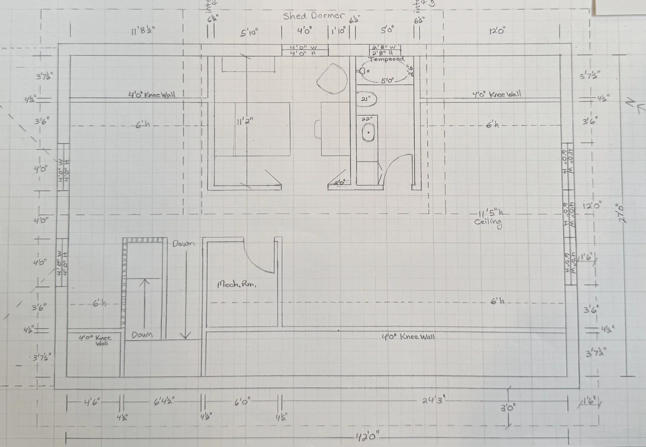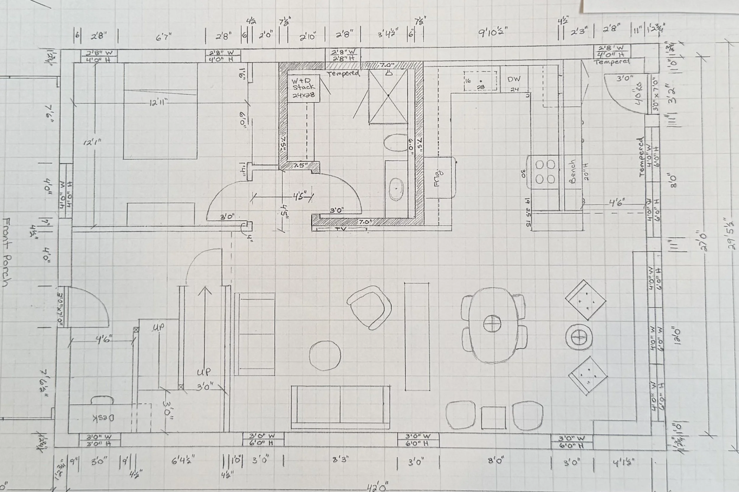 Creating the interior plan was an organic process that evolved over a few seasons. We’d talk about our living patterns, space efficiency, and maintenance ease. I’d draw various floor plans and wall elevations, Tim would explain the construction feasibilities and realities, and we’d brainstorm cost-friendly approaches. We continued this drawing and talking until eventually our overall design emerged.
